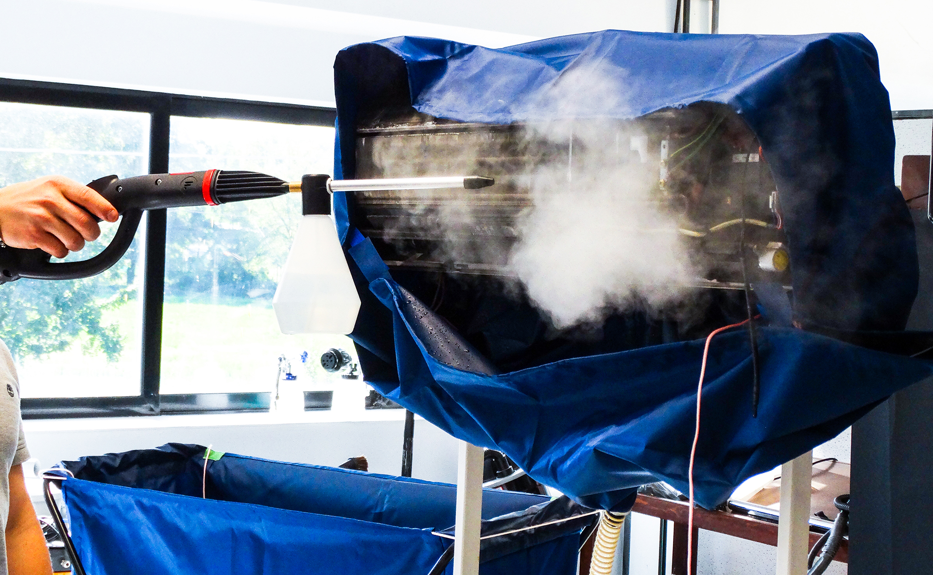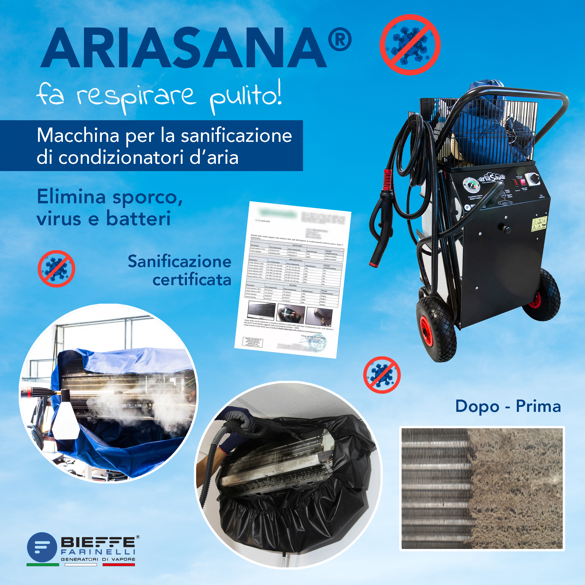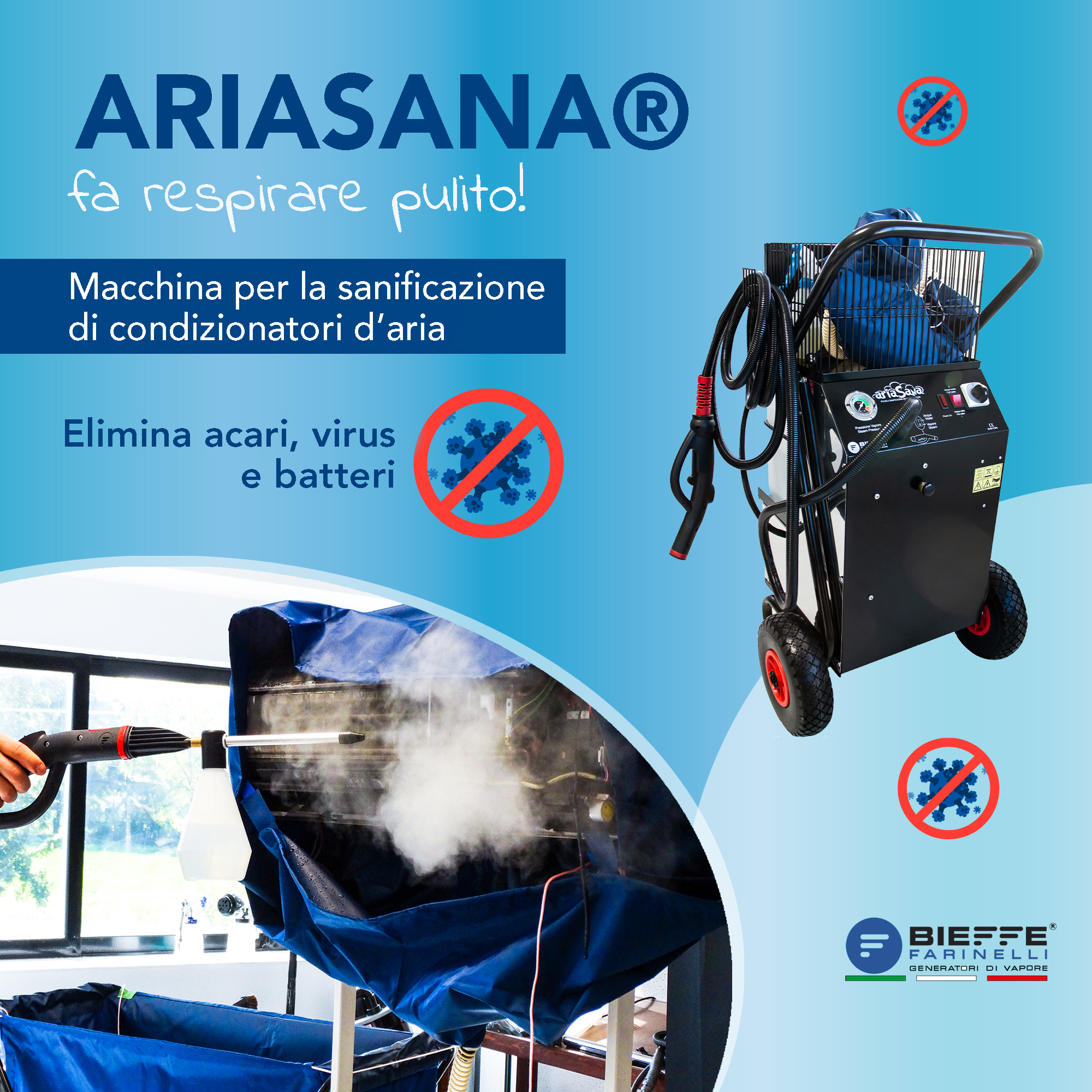 AriaSana è una rivoluzione ineguagliabile nel settore della pulizia e sanificazione dei condizionatori. Il condizionatore sporco e carico di batteri, con AriaSana torna come nuovo. Un nuovo servizio utile per il cliente, una nuova opportunità di guadagno per l’operatore. Il generatore a vapore garantisce il rispetto della disposizione di legge prevista dal D.Lgs 81/08 in materia di tutela della salute e della sicurezza nei luoghi di lavoro (all. IV – art.