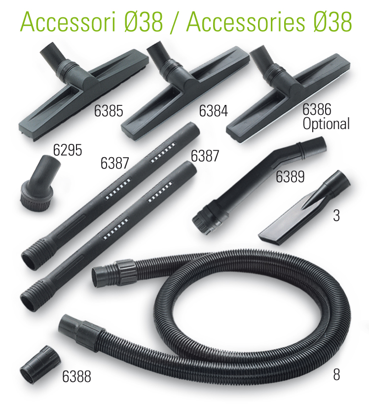 Gli accessori standard in dotazione comprendono bocchette, tubi e spazzole specifiche per diverse applicazioni, garantendo una pulizia completa e mirata a seconda delle esigenze.