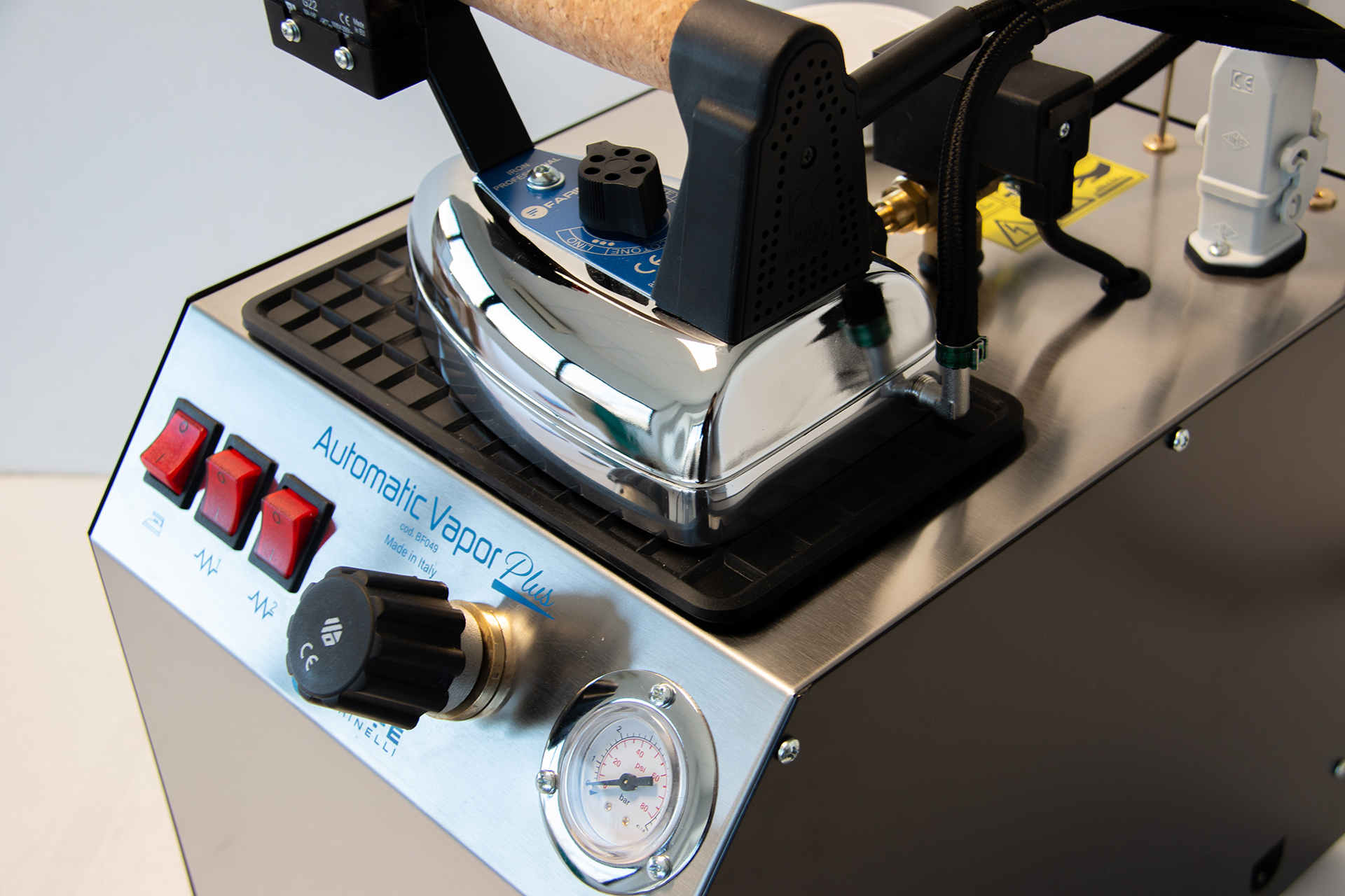 Generatore di vapore con sistema di ricarica automatica e caldaia da 2,8 lt. AUTOMATIC VAPOR PLUS può essere usato sia appoggiato su banco che fissato a parete. Disponibili versioni con ferro 1,5 kg e con ferro professionale 1,7 kg. Possibilità di integrare con due uscite vapore, per eventuale aggiunta di spazzole e/o ferri.