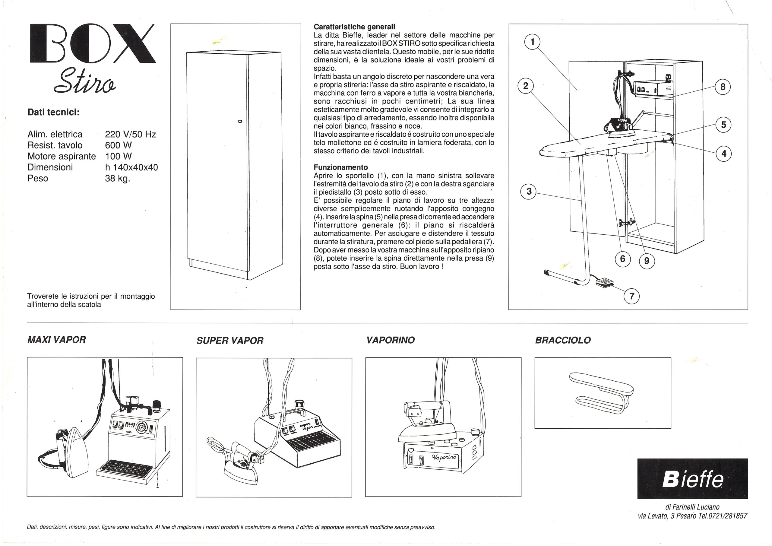 Il BOX STIRO BIEFFE, per le sue ridotte dimensioni, è la soluzione ideale ai vostri problemi di spazio. Infatti, basta un angolo discreto per nascondere una vera e propria stireria. L’asse da stiro, la macchina con ferro a vapore e e tutta la vostra biancheria, sono racchiusi in pochi centimetri. La linea di questo mobile da stiro, esteticamente molto gradevole vi consente di integrarlo a qualsiasi tipo di arredamento, essendo inoltre disponibile nei colori bianco, frassino e noce.