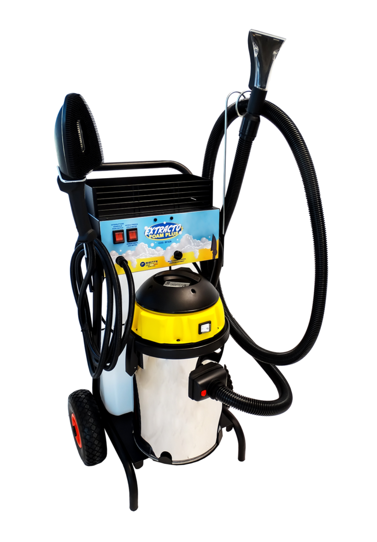 EXTRACTO FOAM PLUS, lavatappezzeria con schiuma attiva ed estrazione con aspiratore bistadio 1400W. Macchina maneggevole per la pulizia di sedili auto, tappeti, divani, tende e materassi, anche a domicilio.