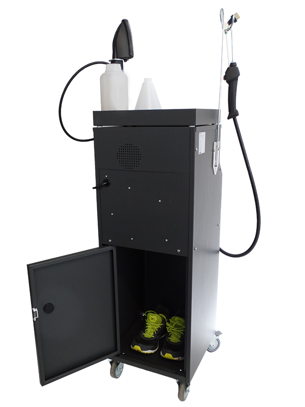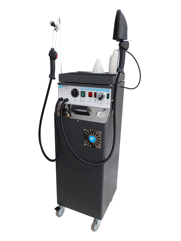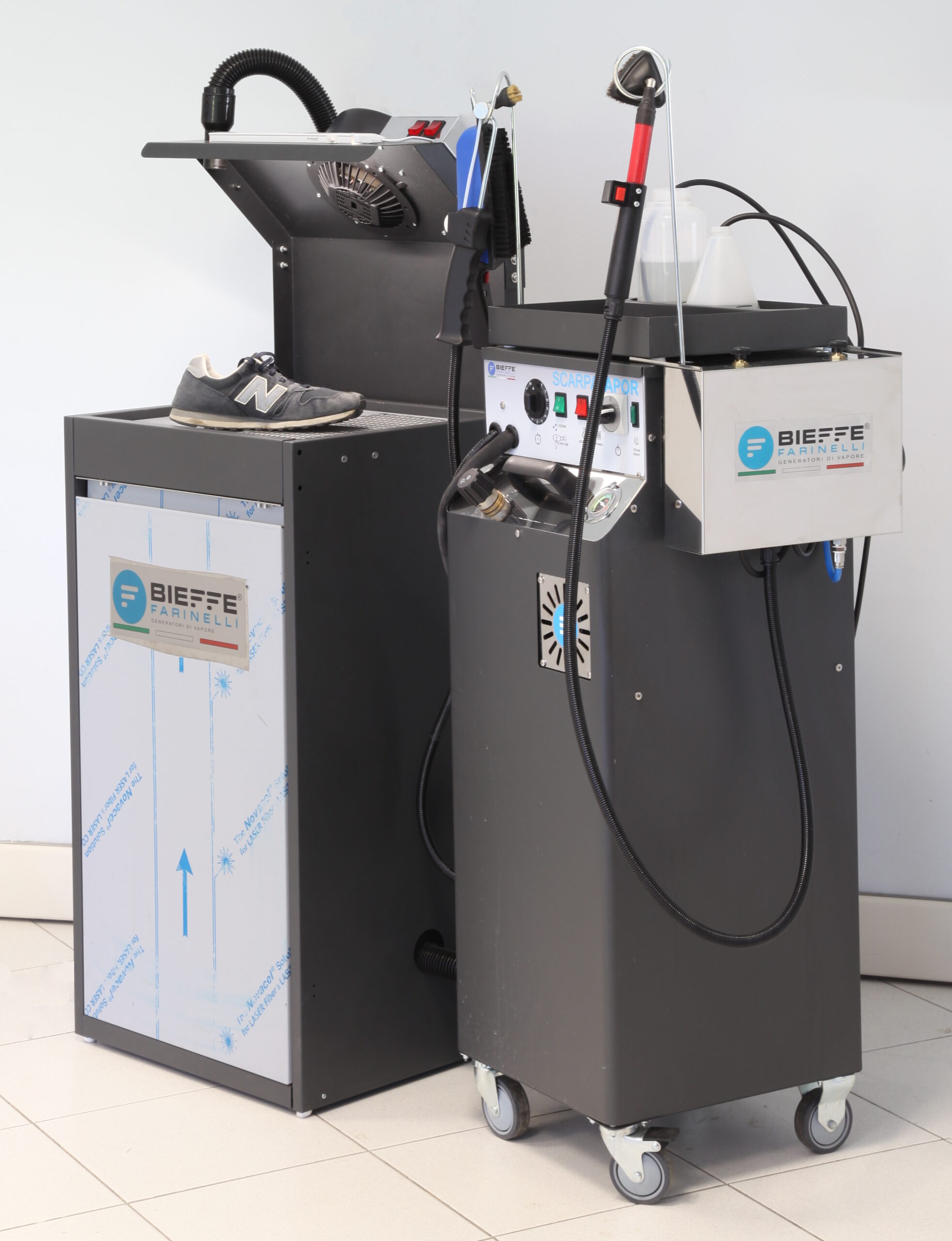 Macchina a vapore professionale, potente e affidabile, per la pulizia esterna ed interna di scarpe, borse, accessori, caschi e molto altro. Con Scarpavapor l’operatore può erogare vapore e detergente e, con speciali spazzole, sciogliere e rimuovere lo sporco piu ostinato dalla superficie per risultati eccellenti. L’asciugatura ad aria calda, rapida e delicata ridona morbidezza e grazie al generatore di ozono incluso, dà una sanificazione completa eliminando odori e batteri. Scarpavapor può essere utilizzata in piccoli spazi senza problemi di scarico acqua e non richiede installazioni particolari.