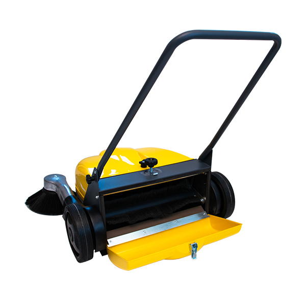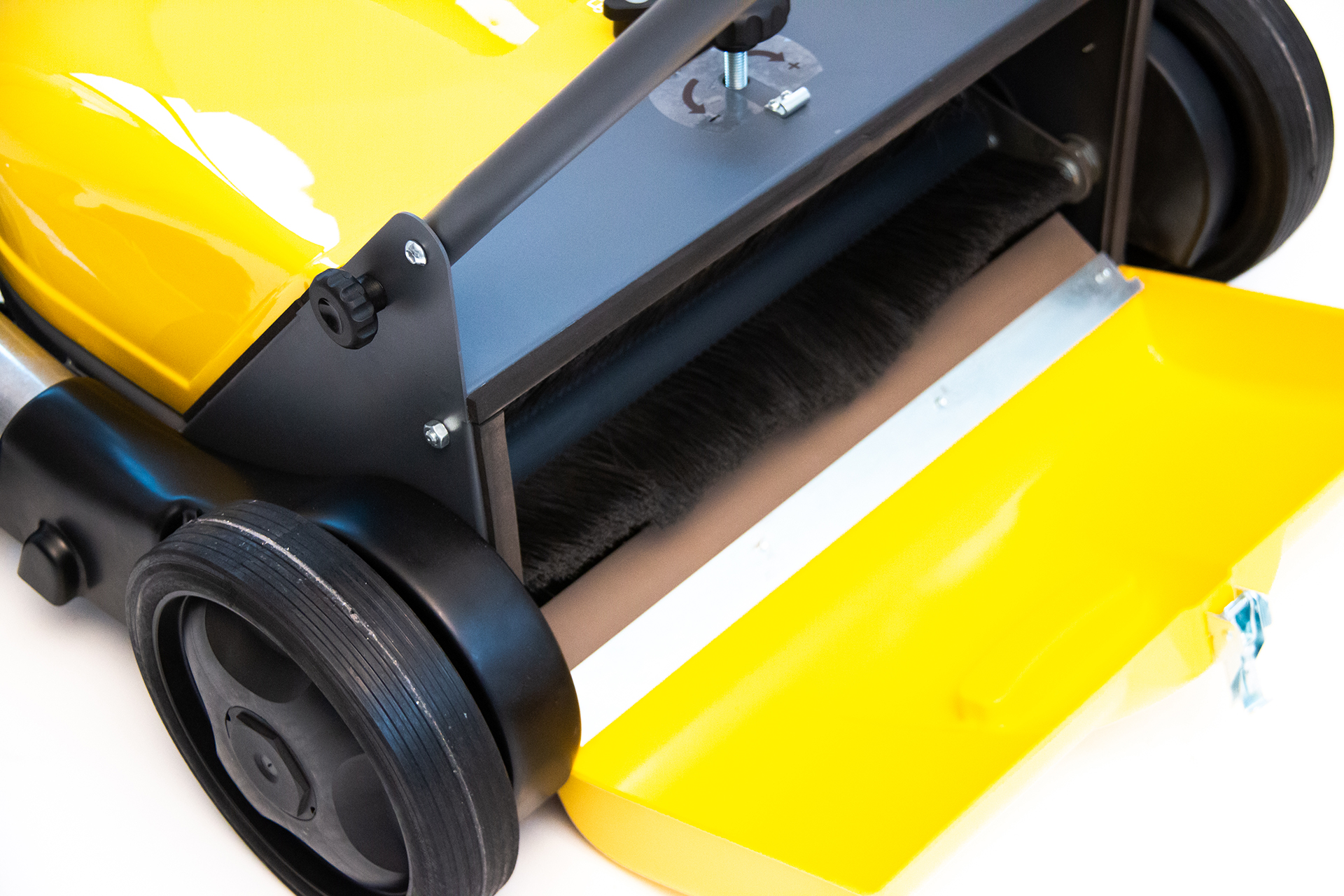 La spazzatrice a funzionamento manuale con doppia spazzola FLASH 950M, leggera e maneggevole, raccoglie efficacemente sporco e polvere su ogni tipo di pavimentazione.
